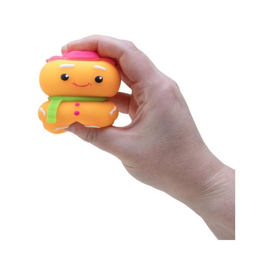 Meet your crunchy, glowing gingerbread buddy! A sweet, squishy cookie pal in his warm hat and scarf with a filling that crunches like gingerbread for sensory satisfaction!