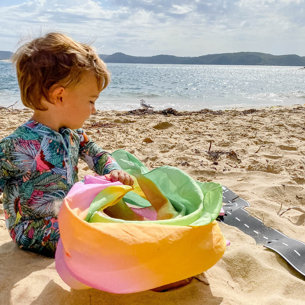 The Sherbet Play Silkie is the perfect addition to any child’s playtime with its stunning fluorescent colour palette. The bold and bright colours of this play silk are reminiscent of the sweet and tangy flavours of sherbet, inspiring a playful and lively experience for your little one. The Sherbet Play Silkie is not only perfect for indoor play, but it also makes an excellent beach accessory, with its eye-catching colours that stand out in the sun and sand.