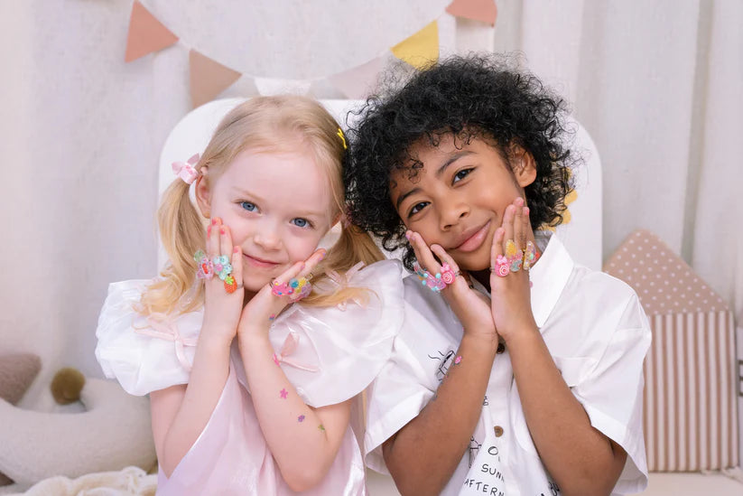 Presented in a vibrant pink package adorned with cakes and confectionery, these rings are perfect for gifting, party favours, or adding sparkle to any dress-up box. Sized for little fingers and designed to delight, they're a playful way to encourage creativity and self-expression.