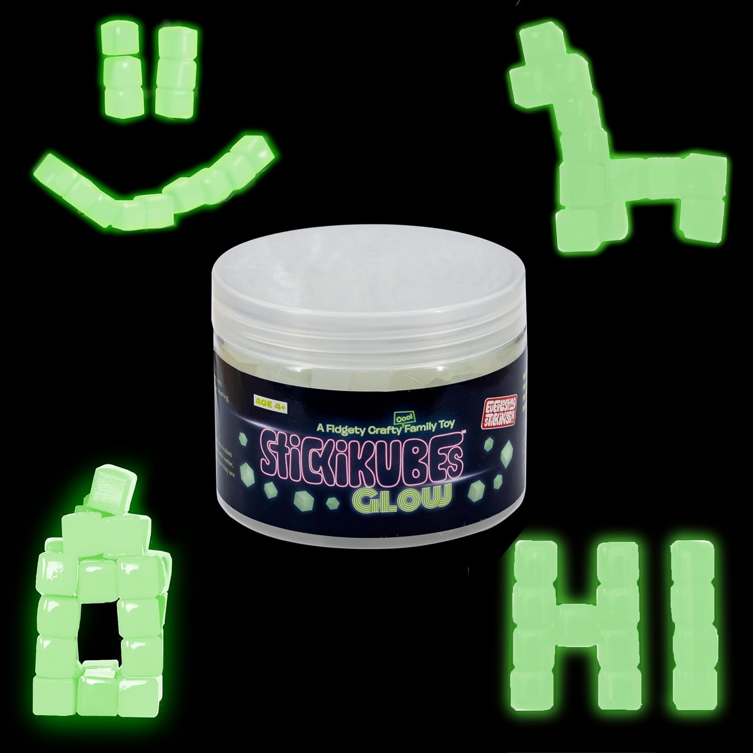 Includes 125 Glow in the Dark StickiKubes. Comes in a reusable plastic tub with built-in strainer for quick cleaning and easy storage.