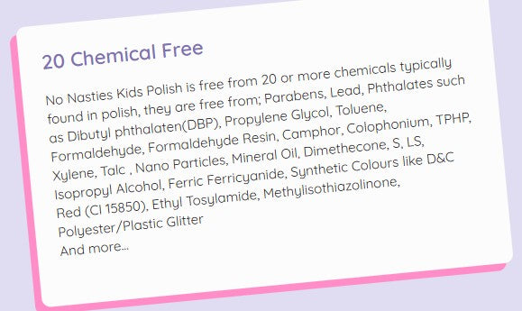 3. Easy Removal (No Nail Polish Remover Required!): Parents will appreciate the hassle-free removal process for a few reasons... Kids almost always have “accidents” while asserting their independence in applying their nail polish, and with No Nasties Kids 20 Free Scratch off polish, when an accident occurs, in most cases the polish can be easily scratched off or washed out! No Nasties nail polish can be easily removed with gentle scrubbing or simply scratching off, minimizing any potential damage to the nails, your coffee table or their bed spread! PS We do not recommend leaving children unattended whilst playing with any makeup products, including polish!