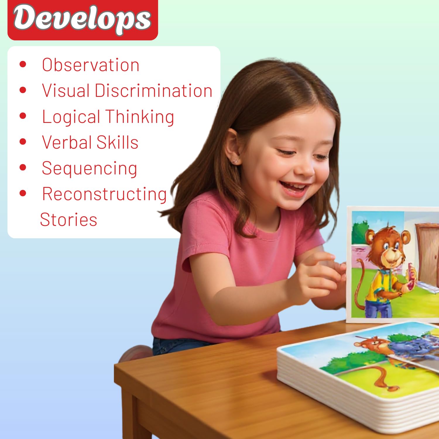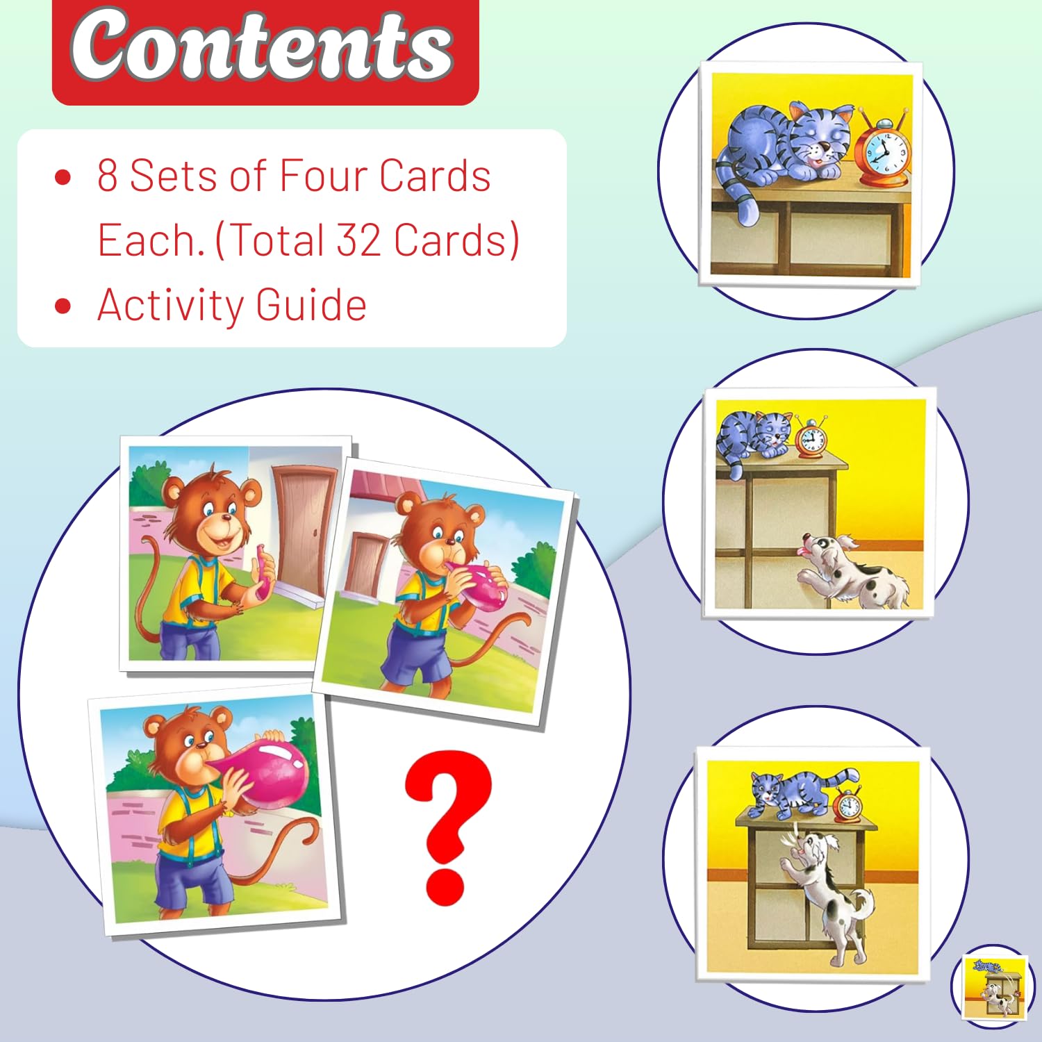 To get started sort each set, explain each card of every set, arrange them in proper sequence and children can narrate the story/ happening in his/her own words. Perfect way to improve pre-reading skills in a fun way.