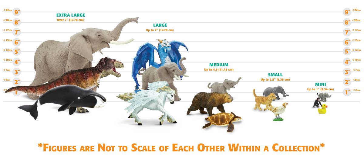 • Safari Ltd figures are not specifically scaled with each other. Please view item details for specific size info. While our toys are not made to scale, many of our collections are generally compatible based on size.