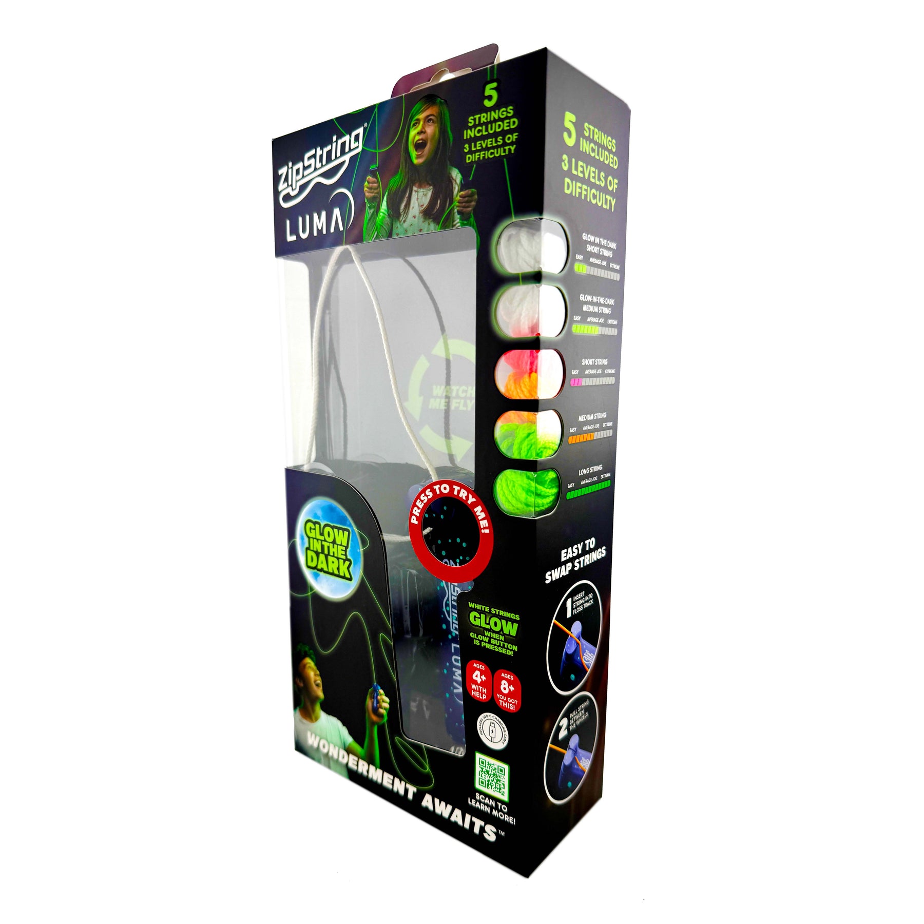 ZipString Luma is the original floating string toy—now with glow-in-the-dark strings and an LED light-up mode for night-time play. It shoots a loop of string that hovers and moves through the air, perfect for showing off tricks anytime, anywhere.