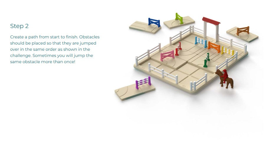 • In the box: 1 game board, 1 exit gate, 10 puzzle pieces with obstacles and paths, 1 horse with rider, booklet with 80 challenges